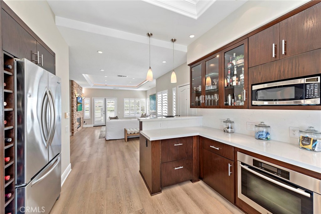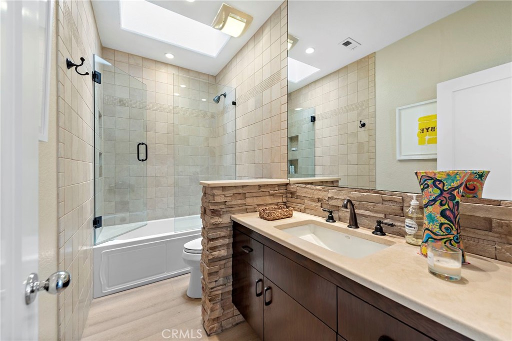 The kitchen is a masterpiece, boasting bespoke contemporary cabinets, a coffered ceiling, quartz backsplash, and high-end stainless appliances, including a Wolf gas range, Miele oven, Bosch dishwasher, and refrigerator. The master bath features sleek custom cabinetry, dual sinks, and a large walk-in shower with a glass enclosure, all illuminated by a skylight. Recessed lighting throughout, a recently installed AC, and a spacious two-car garage add to the allure of this turnkey home.