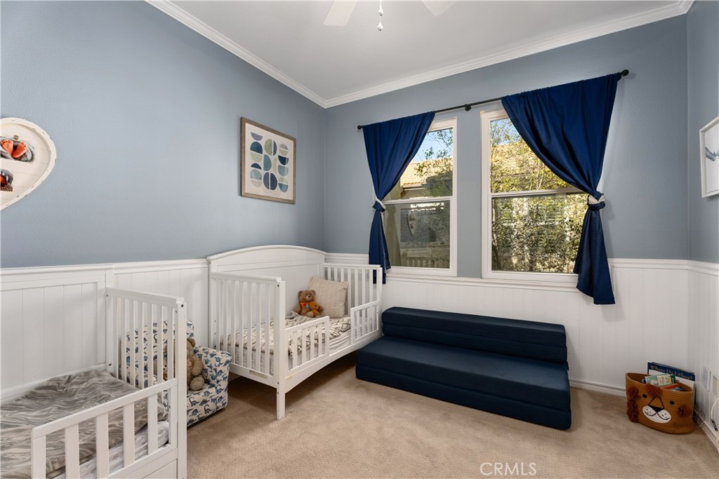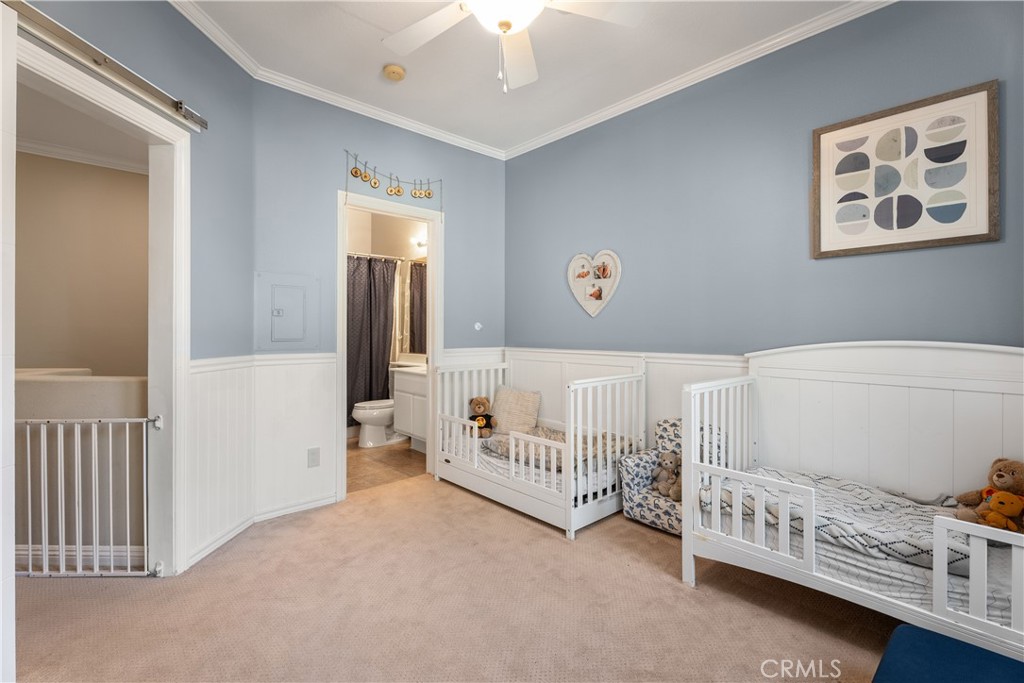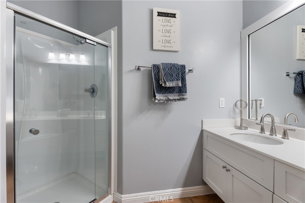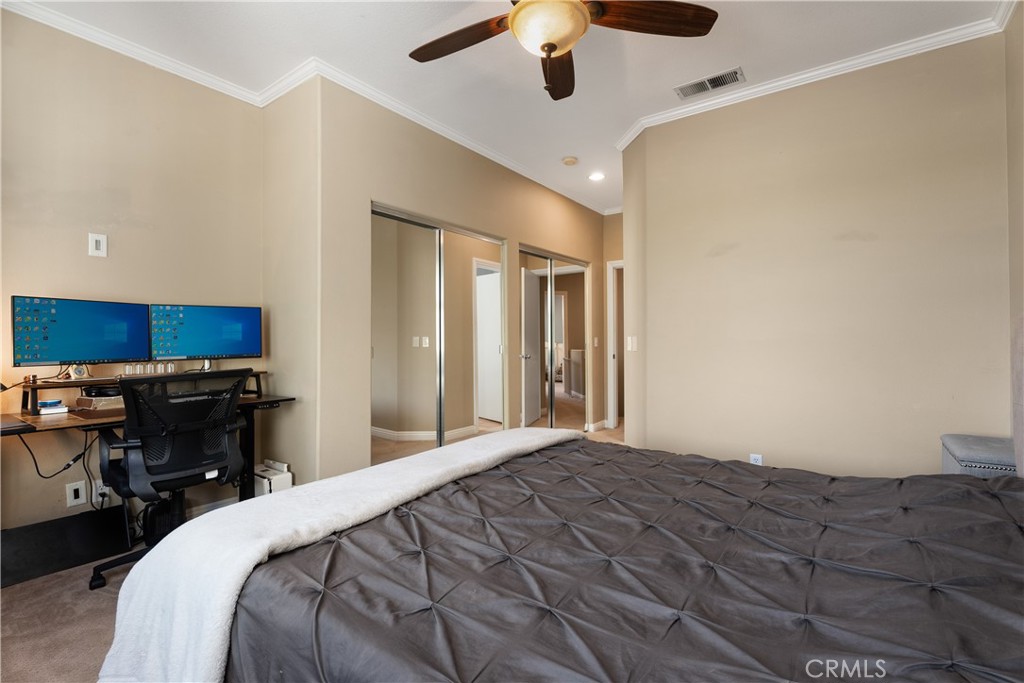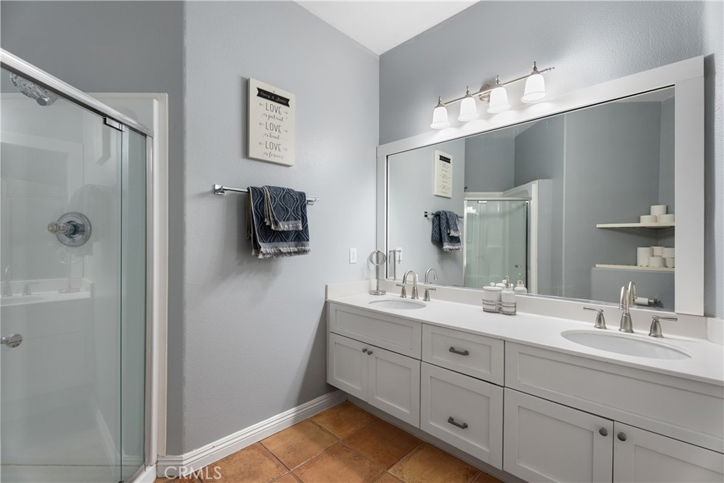 Upstairs, the townhome boasts two primary suites. The first suite includes a walk-in closet, shiplap wall accents, and a shower-tub combination, creating a cozy yet chic retreat. The second suite features an en-suite bathroom with a dual sink vanity, large, mirrored closet doors, and a beautifully finished vanity, providing both luxury and convenience.