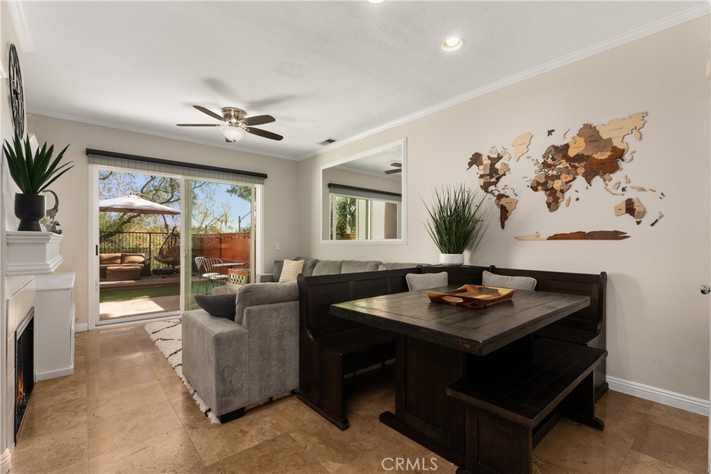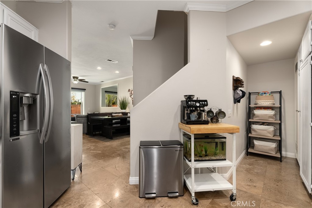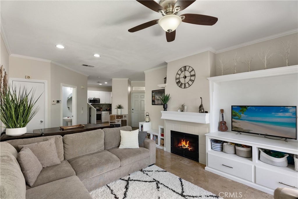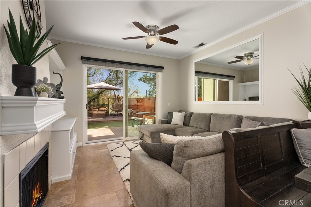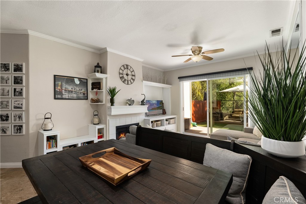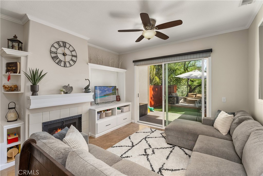 Upon entering, you'll be welcomed by a spacious living room adorned with high ceilings and custom built-ins. This area seamlessly flows into a private patio, offering a lovely view of the surrounding trees and skyline.